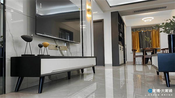 客廳背景墻則是以黑色金屬條和小條黑鏡裝點(diǎn),